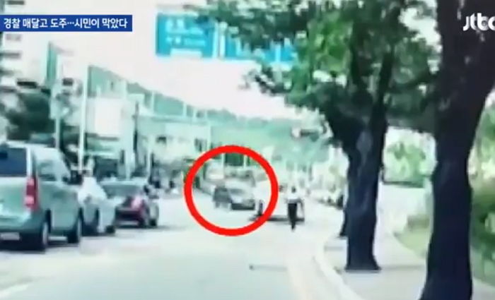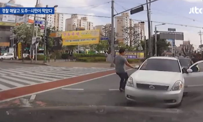 윤씨는 도주하는 차량의 도주로를 가로막아 섰고, 윤씨의 차에 가로막힌 A씨의 승용차는 멈춰 서게 됐다.