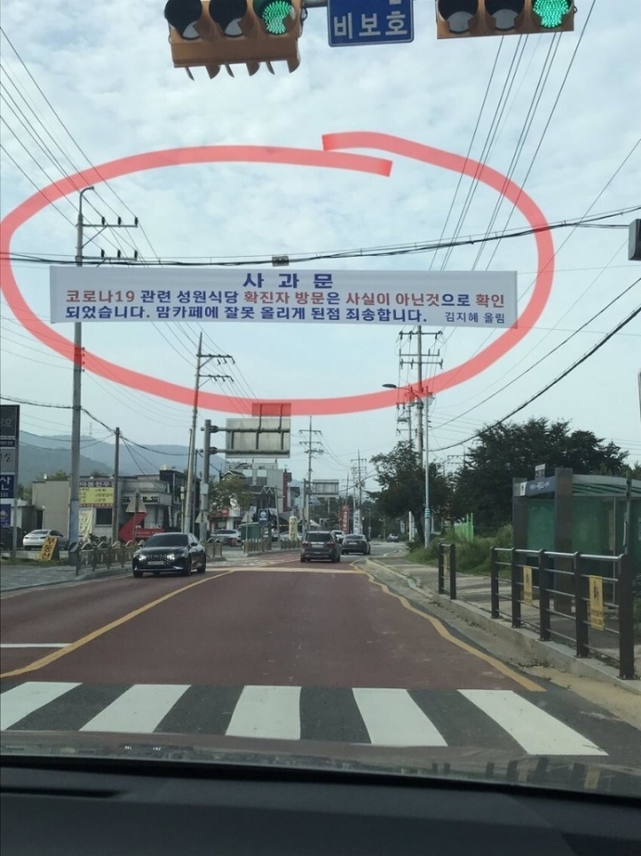 현수막에는 ‘사과문’이란 제목으로 ‘코로나19 관련 성원식당 확진자 방문은 사실이 아닌 것으로 확인되었습니다. 맘까페에 잘못 올리게 된 점 죄송합니다’라고 적혀 있었다.
