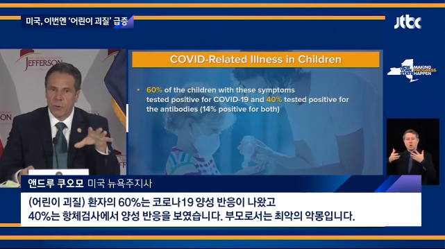 이에 미국 앤드루 쿠오모 뉴욕주지사는 “(어린이 괴질) 환자의 60%는 코로나19 양성 반응을 보였고, 40%는 항체검사에서 양성 반응을 보였다”라고 말했다.