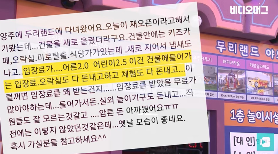 또한 입장료가 비싸다는 지적에 대해서는 “1년간 시장 조사를 했다. 보통 주택가에 있는 키즈카페들이 200~800평 하고 시간도 4~6시간 노는데 1만 5천원에서 2만 5천원을 받는다. ‘두리랜드’는 전체가 4,000평 정도 된다. 시간 제한을 두지 않고 하루종일 놀면, 즐기면 되지 않겠냐”라고 반문했다.