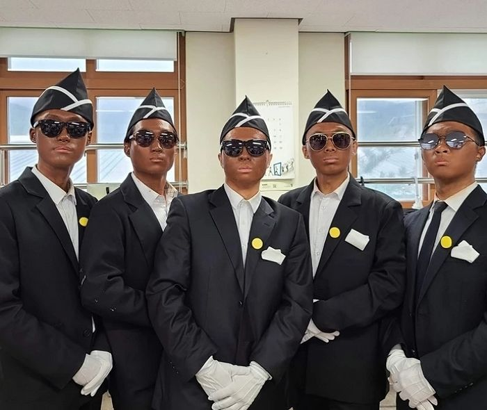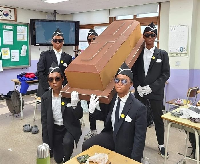 해당 사진은 5명의 학생이 관을 만들고 피부를 검게 칠하여 찍은 사진으로 전 세계적으로 화제가 되었던 ‘관짝소년단’을 패러디한 사진이다.