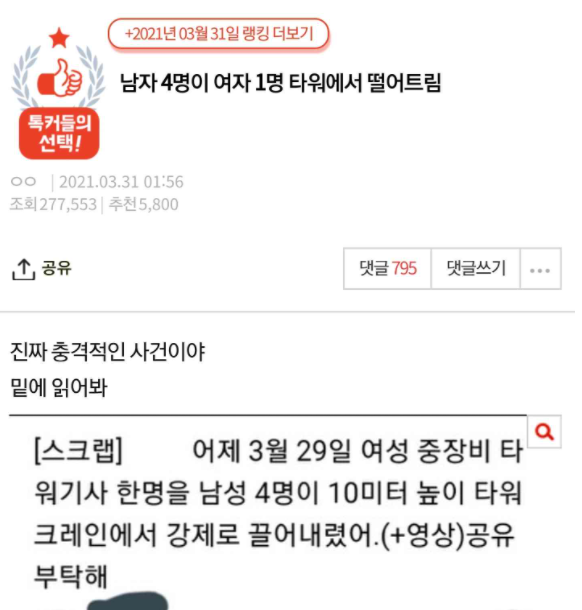 게시글을 올린 작성자 A씨는 “남자 4명이 여자 1명 타워에서 떨어트림”이라는 제목의 글로 많은 이들의 관심을 끌었다.
