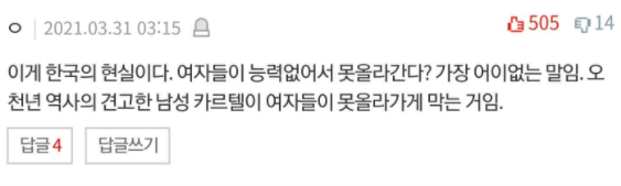 여성의 인권을 향상시킨다는 것은 사회에서도 꼭 필요한 요소중 하나지만 몇몇 발언과 행동들은 일반여성들까지도 눈살을 찌푸리게 만든다.