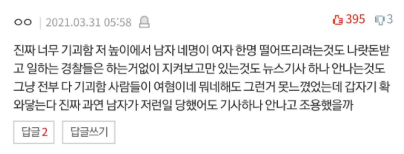 “남자 4명이 여자 1명 타워에서 떨어트림”