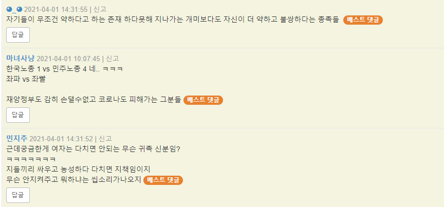 자신들을 여성 인권 향상 선봉장이라는 여성들이 극단적인 남성혐오를 더불어 미러링이라면서 각종 사회적 논란을 만들었다.