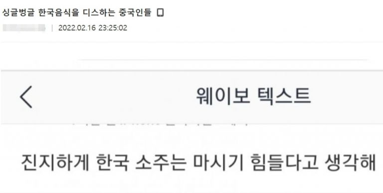 해당 글 작성자가 캡처한 중국 ‘웨이보’ 화면에는 “진지하게 한국 소주는 마시기 힘들다고 생각해”라는 문장이 써있었다.