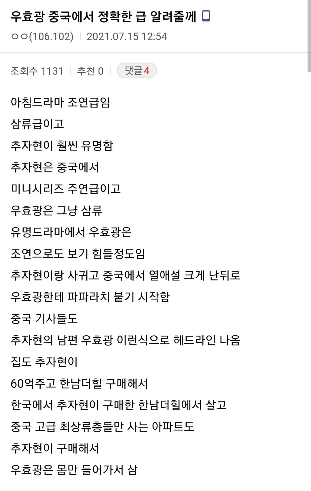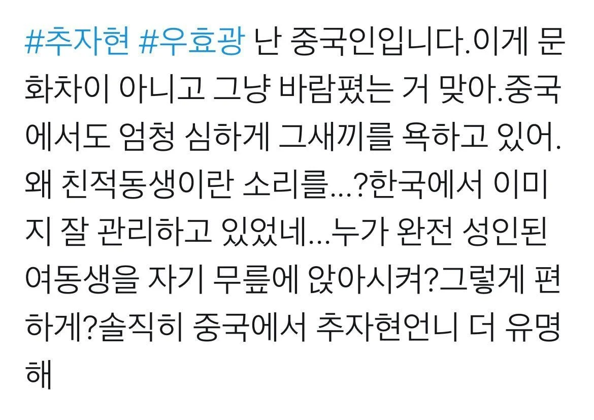 해당 글에는 최근 화제가 되고 있는 배우 추자현의 남편 우효광과 관련된 중국인들의 반응이 담겨 있었다.