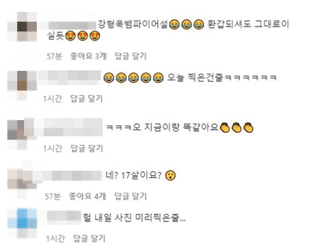 네티즌들은 “강형욱 뱀파이어설. 환갑 되셔도 그대로 이실 듯”, “오늘 찍은 건 줄 알았네요”, “지금이랑 너무 똑같아요”, “네? 17살이요?”, “내일 사진 미리 찍은 줄” 등의 다양한 댓글을 남기는 모습이었다.