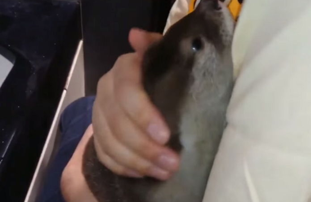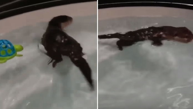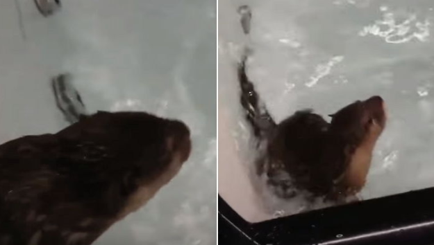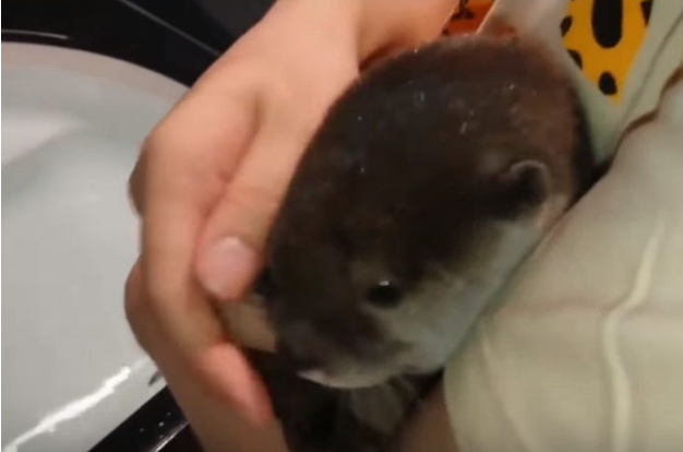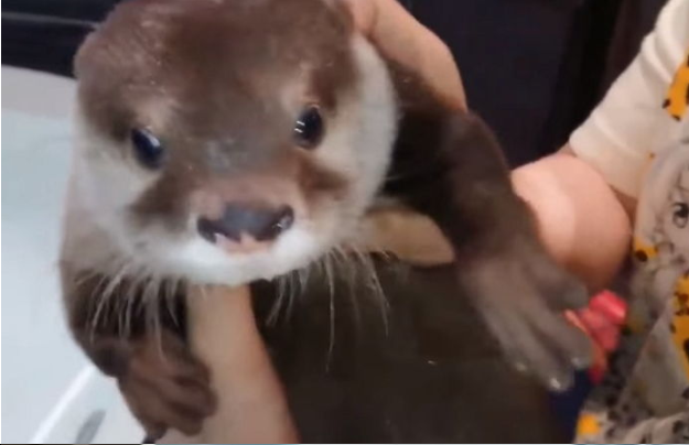 공개된 영상 속 아기 수달은 물이 가득 찬 욕조 앞에 주인 품에 꼭 안겨있는 모습이다.