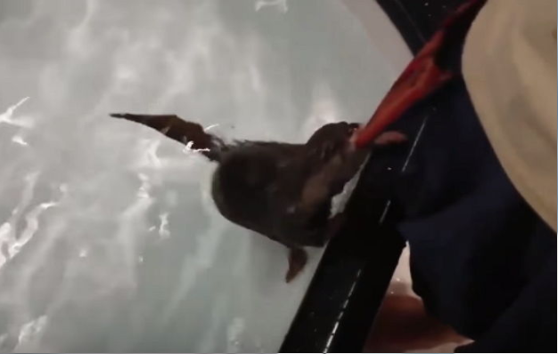 수달은 차가운 물의 감촉에 어리둥절해하더니 이내 물속에 들어가기 싫은듯 주인의 팔에서 떨어지지 않으려 필사적으로 매달렸다.