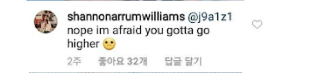 그 질문을 한 누리꾼을 태그하며 “nope im afraid you gotta go higher”라고 말했다.