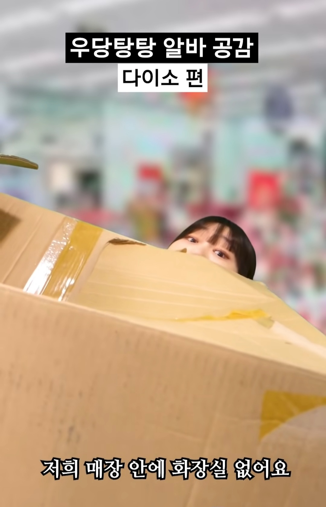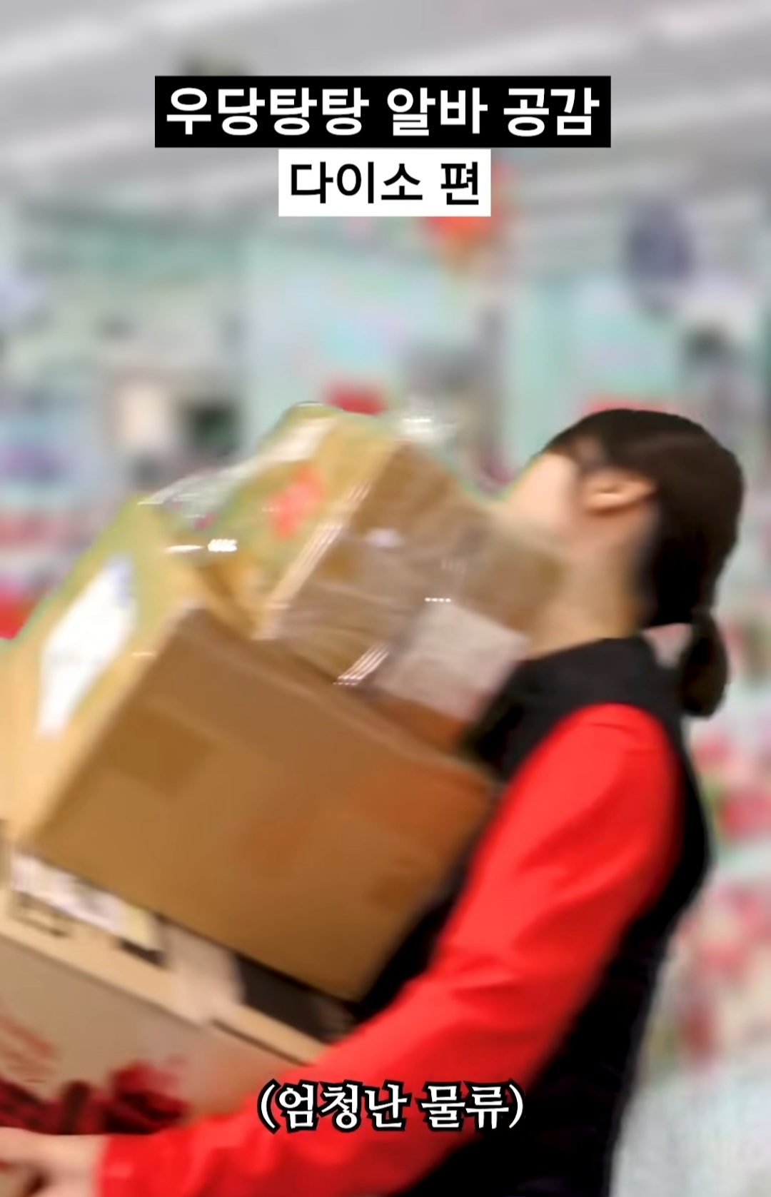 해당 유튜버는 다이소 알바생으로 변신한 뒤, 많은 양의 박스와 물류 더미를 옮기면서 고객을 응대하는 모습을 담았다.
