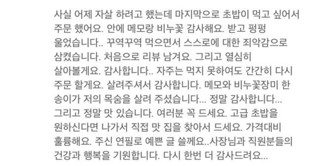 리뷰를 남긴 사용자 ‘응ㅇㅁ’은 “사실 어제 자살하려고 했는데 마지막으로 초밥이 먹고 싶어서 주문했다”며 글을 시작했다.
