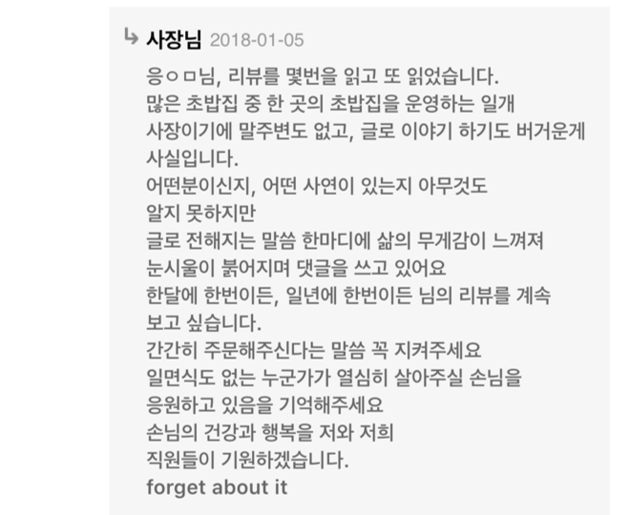 이 리뷰에 사장님은 “리뷰를 몇 번을 읽고 또 읽었다”며 리뷰 한 마디 한 마디에 무게감이 느껴져 눈시울이 붉어졌다고 전했다.