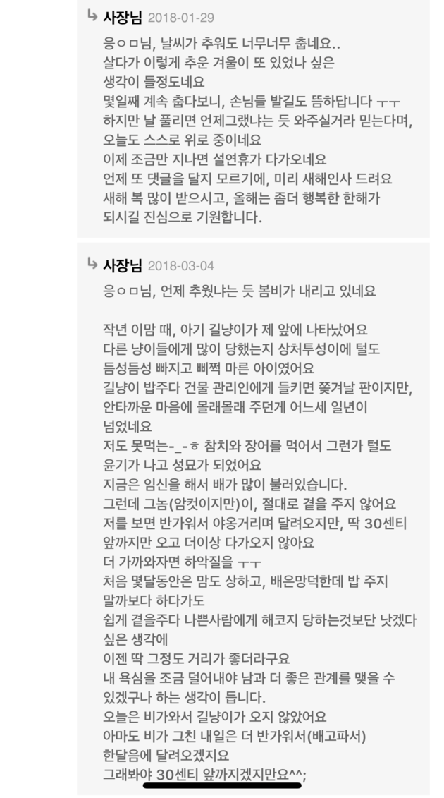 “주말 잘 보내셨는지요”, “날씨가 춥네요”하는 안부인사부터 자신이 돌봐주는 아기 고양이 얘기까지 정성을 담아 적은 댓글에 손님을 생각하는 사장님의 따뜻한 마음이 엿보인다.