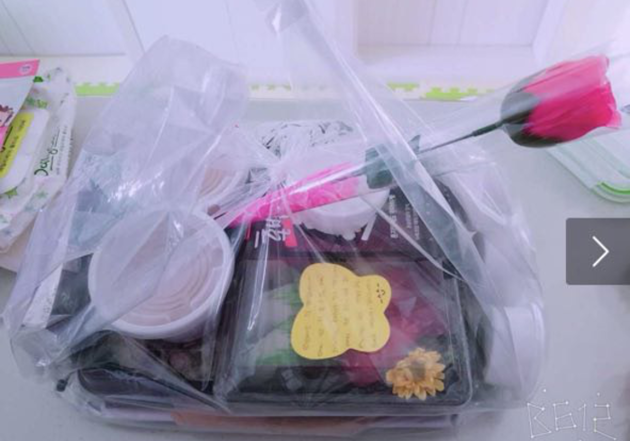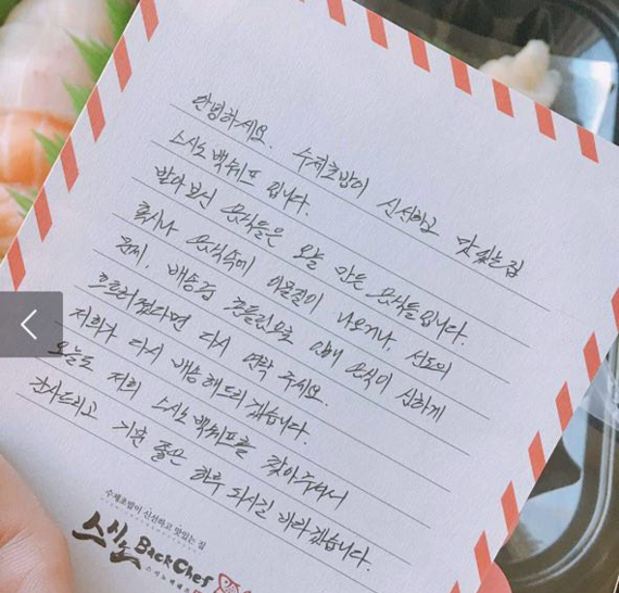 리뷰에 따르면, 초밥집 사장님은 초밥과 함께 짧은 메모와 비누꽃 장미 한 송이를 함께 보냈다.