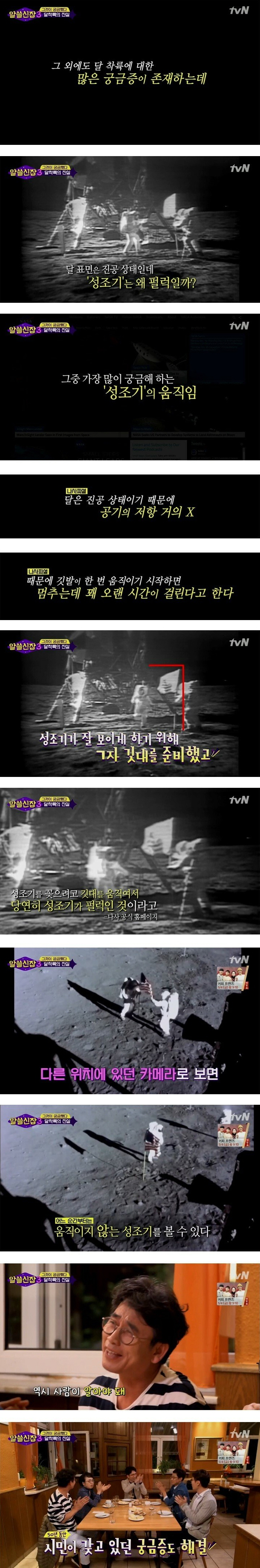 이에 다른 출연진은 “달 착륙선이 다리가 3개가 있는데 착륙선에서 떨어져서 찍은 것이 아니라 다리 쪽에 달린 카메라가 아래에서 위로 찍은 것이다.”라고 답했다.