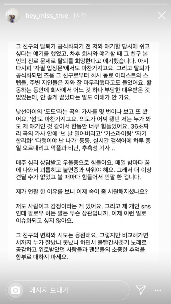 이어 “아시다시피 ‘자필 입장문’에서도 마찬가지다. 그리고 탈퇴가 공식화되던 즈음 그 친구로부터 회사 동료 아티스트와 스텝들, 주변 지인들은 저와 잘 마무리됐다고도 들었다”면서 “활동하는 동안에 회사에서 어느 것 하나 부당한 대우받은 것 없었는데, 안 좋게 끝났다는 말도 이해가 안 간다”라며 토로했다.