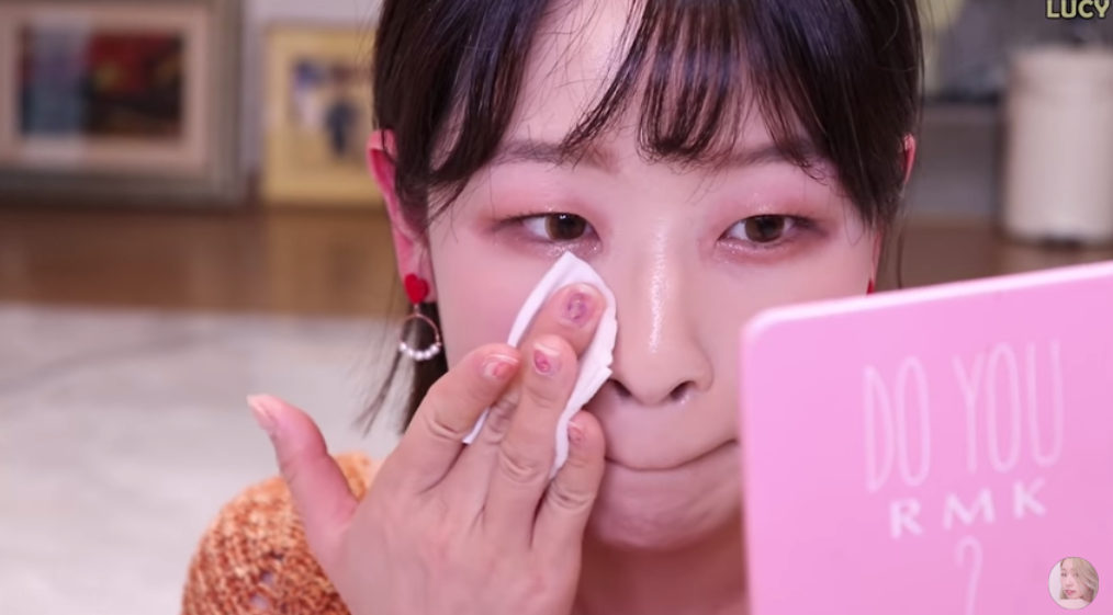하지만 클렌징 워터로 한쪽의 볼 화장을 지우자 화장에 가려져 있던 붉은 기가 선명하게 보이기 시작했다.