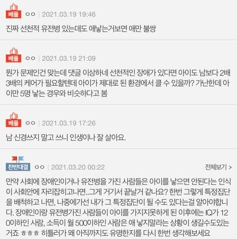 이어서 “유튜브를 보다 장애인들끼리 결혼해서 아이도 선천적 장애인으로 태어난 걸 봤는데 아이는 무슨 죄인 거죠?”라며 자신의 주장을 덧붙였다.