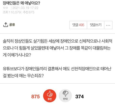 글쓴이는 “솔직히 정상인들도 살기 힘든 세상에서 장애인으로 신체적으로나 사회적으로나 더 힘들게 살았을 텐데 왜 아이를 낳아서 그 장애를 똑같이 대물림하는 게 이해가 안 되네요”라고 이야기를 시작했다.