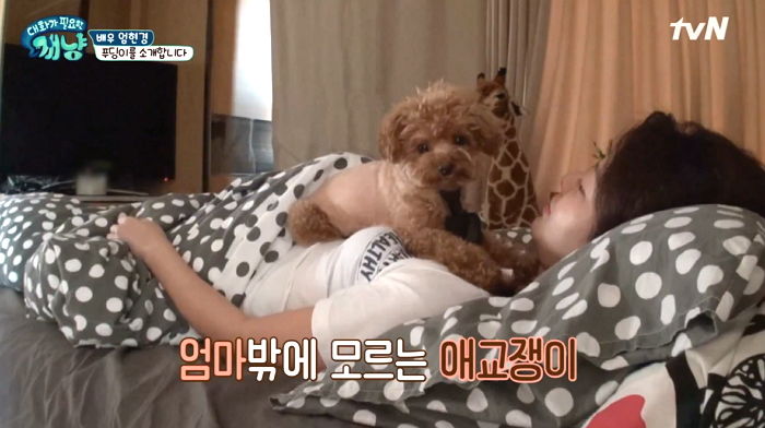 실제 엄현경은 반려견 푸딩을 지극정성으로 돌보며 사랑을 듬뿍 줬다.