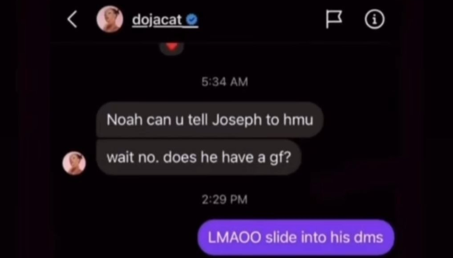 그러나 공개된 DM에는 ‘기묘한이야기’에 출연했던 조셉퀸을 자신에게 소개시켜달라는 도자캣의 부탁이 담겨있었다.