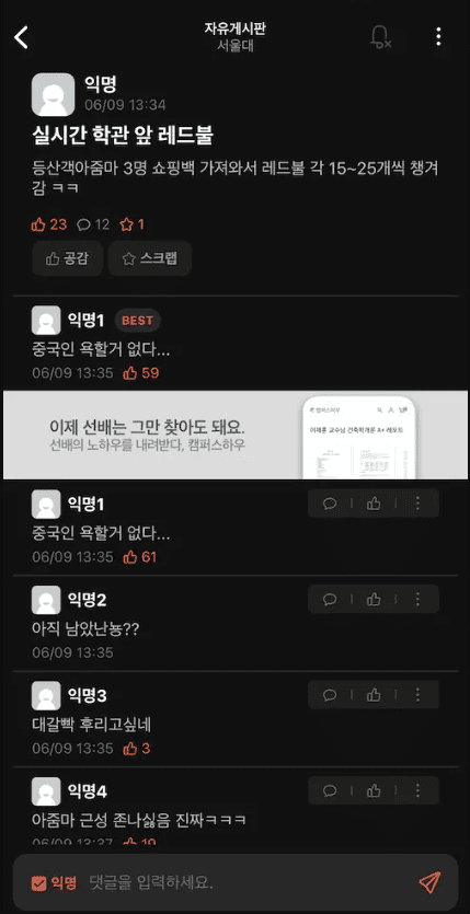 학생들을 위한 이벤트에 외부 방문객들이 끼어들자, 여러 민원의 댓글을 볼 수 있었다.
