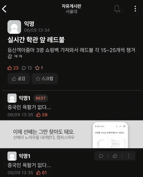 한 학생은 “중국인 욕할 거 없다”라며 일침을 날리는 댓글도 볼 수 있었다.