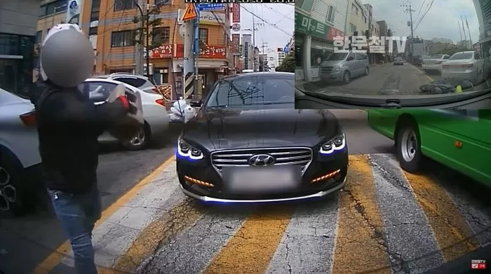 사고 피해자였던 오토바이 운전자는 발길질로 양쪽 사이드미러를 부수더니 이윽고 벽돌을 가져와 차량의 뒷 유리창을 부쉈다.