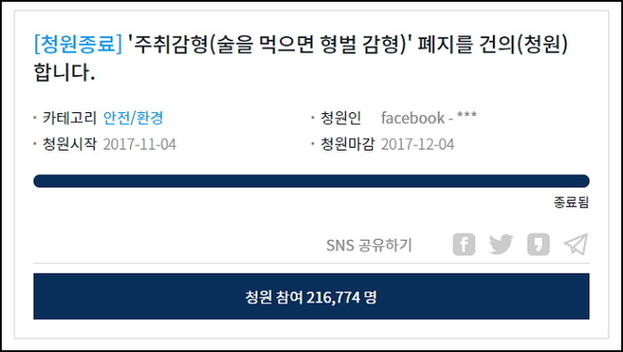 이번 청원이 한 달 안에 20만명 이상의 동의를 얻어내면서, 주취 감형에 대한 청와대 공식 답변도 들을 수 있게 됐다.