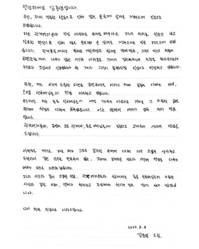항의가 빗발치자 김준영은 지난 8일 자신의 인스타그램에 “관객 여러분과 직접 마주하는 뮤지컬 배우라는 저의 위치를 한순간 잊고 잘못된 판단으로 인해 많은 분들께 큰 심려를 끼쳐드리는 일을 저지르게 됐다”라며 “누구보다 조심하고 신중했어야 할 제가 그러지 못했던 점 진심으로 반성하고 있다”라고 사과했다.