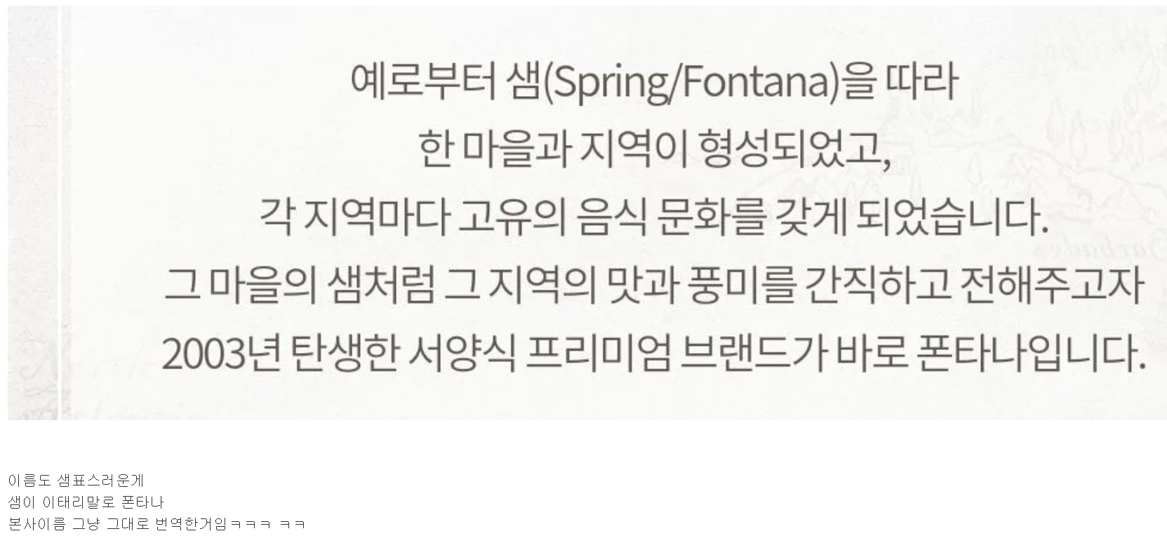 또 “폰타나를 정말 맛있게 먹고 있는데 역시 우리 브랜드여서 제 입에 맛있는 거였군요.”, “샘이 이태리 말로 폰타나라니 이름의 어원이 정말 재미있네요ㅋㅋ”라는 반응도 보였다.