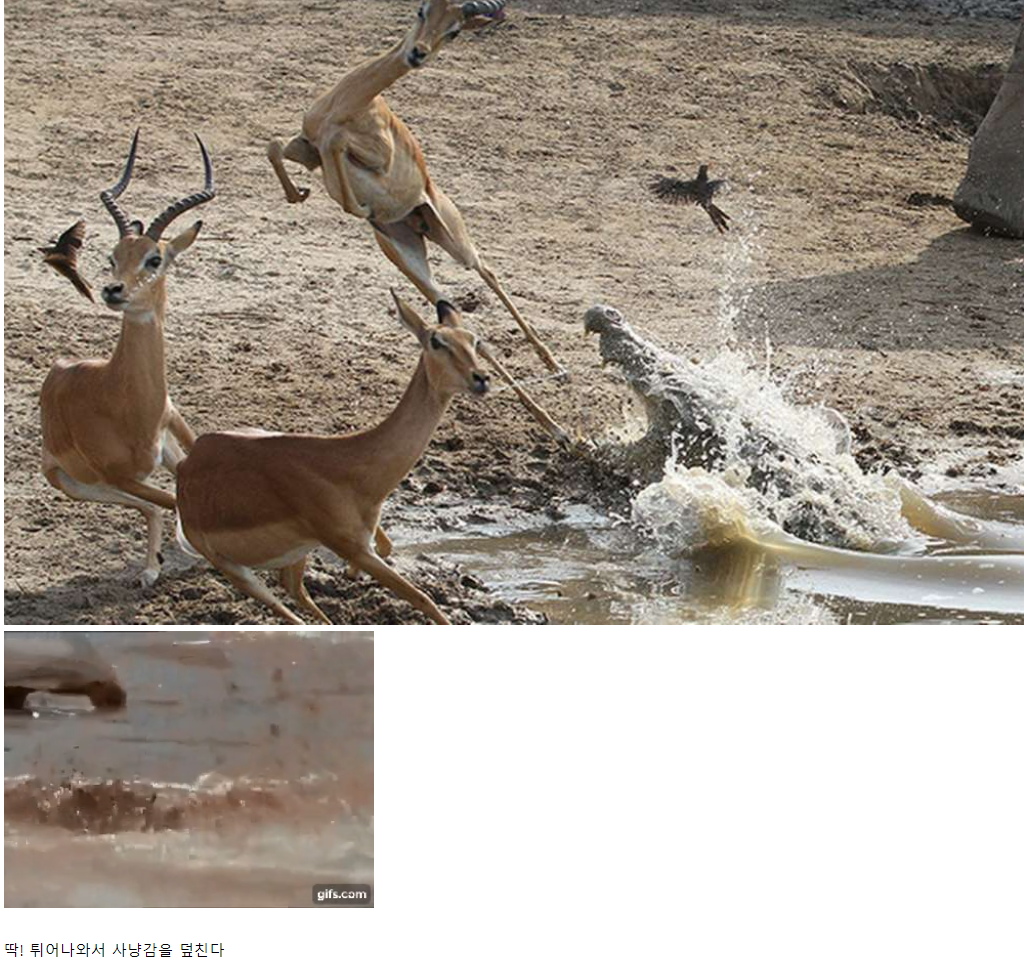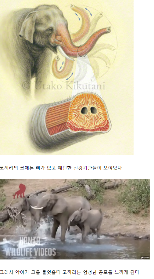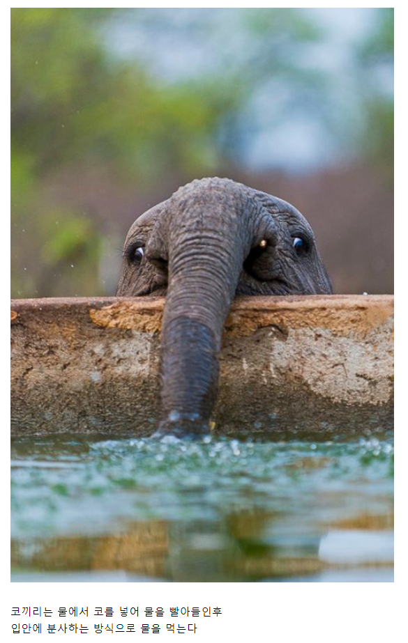 코끼리는 물속에 코를 넣어 빨아들인 후 입안에 분사하는 방식으로 물을 먹는데 물속에는 악어가 있는 경우가 많다.