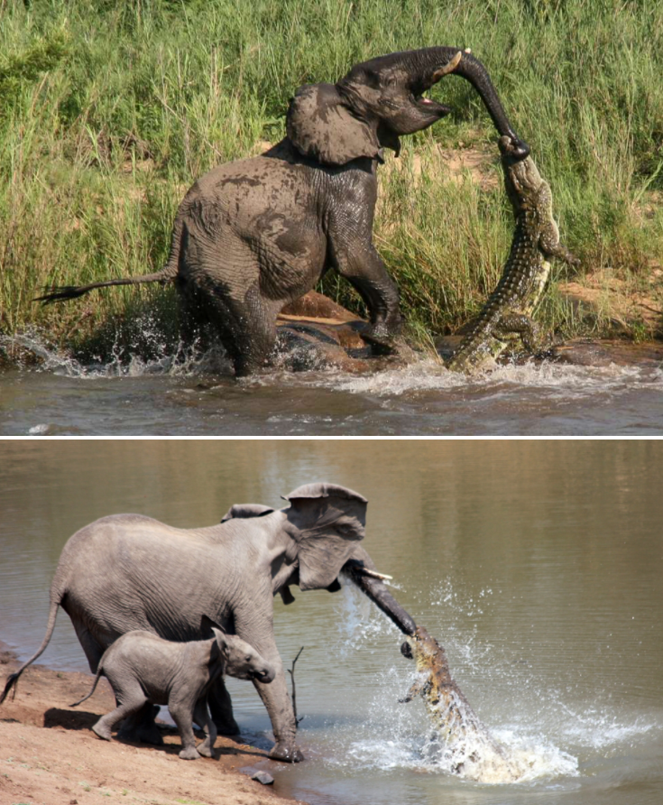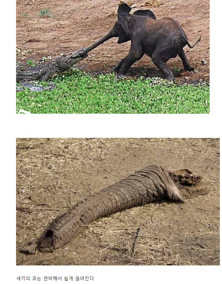 어린 코끼리의 경우 악어에게 코를 물리게 되면 쉽게 절단되어 살아가는 데 큰 영향을 끼친다.