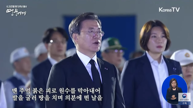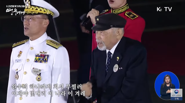 이어 6·25의 노래가 시작되자 노병은 주먹을 쥐고 위아래로 힘차게 힘들며 기강에 찬 눈빛으로 노래를 따라 불렀다.