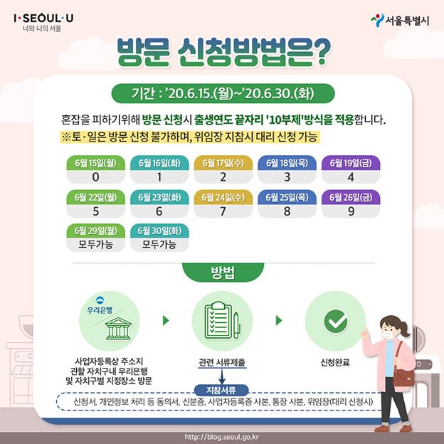 방문접수를 원할경우 6월 15일부터 30일까지 사업장 소재 자치구 내 ‘우리은행’이나 ‘지정 장소’를 방문하면 된다.