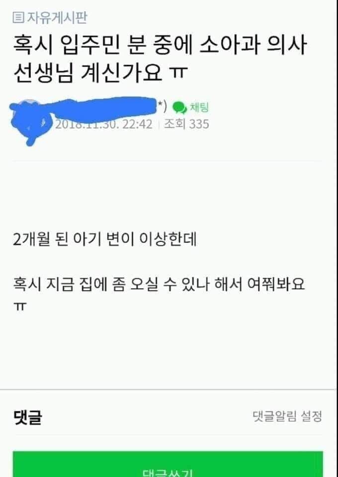 “혹시 입주민 분 중에 소아과 의사 선생님 계신가요”라는 글을 공유한 글이다.