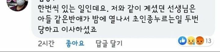 해당 글에 달린 댓글엔 “한번씩 있는 일이다”며”저와 같이 계셨던 선생님은 아들 같은 반 애가 밤에 열이 난다며 초인종을 두 번 누르는 일을 당한 후 이사했다”고 밝혔다.