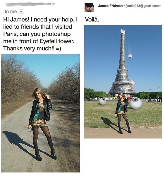 의뢰인 : 제임스! 저는 당신의 도움이 필요해요. 저는 친구들에게 파리에 왔다고 거짓말 했는데, 제가 에펠탑 앞에 있는 것처럼 포토샵 해 줄 수 있나요? 감사해요!