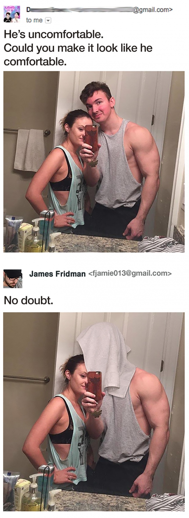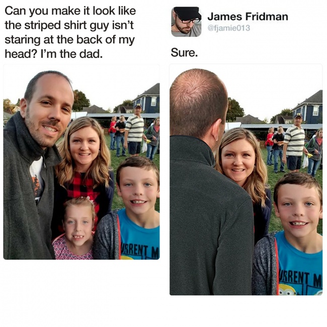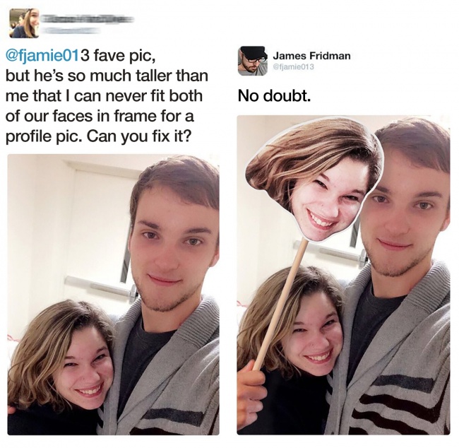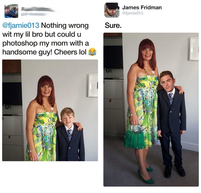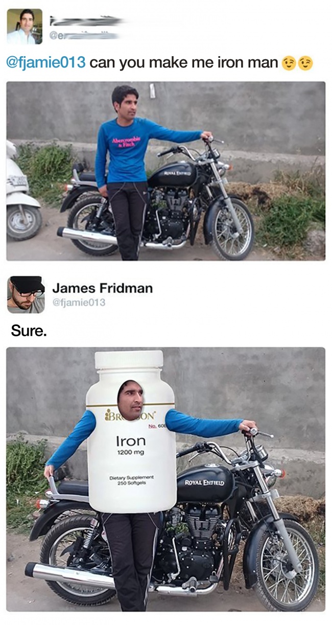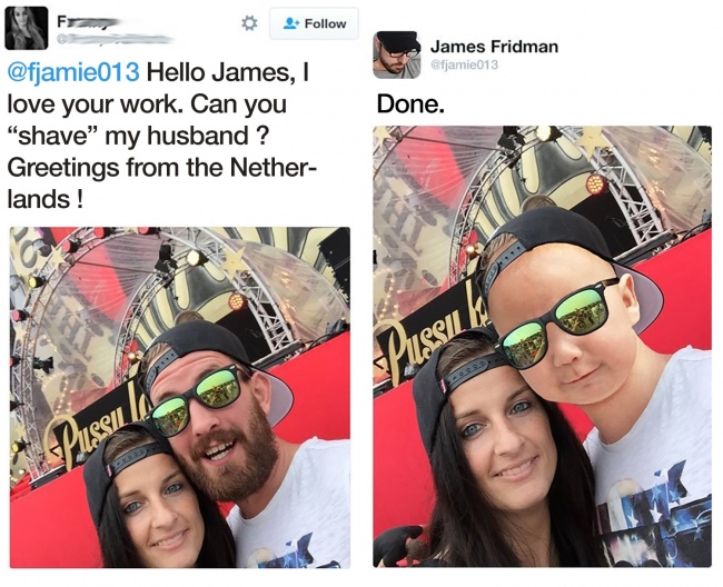 바로 해외에서 ‘포토샵 실력자’로 유명한 제임스 프리드먼(James Fridman)이다. 그는 트위터 계정에서 사람들에게 의뢰를 받아 포토샵 작업을 해 주는데, 사람들의 요구를 자기 방식대로 재치있게 해석해서 ‘비포 앤 애프터’ 사진을 올리기로 유명하다.