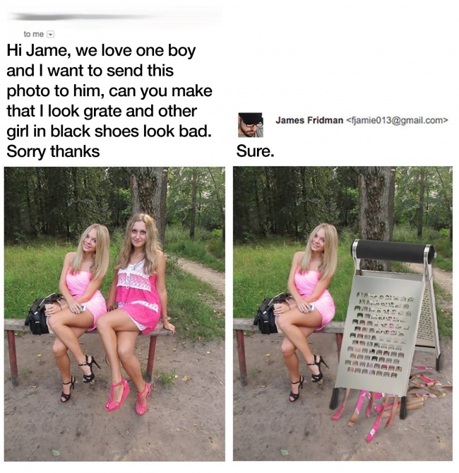 (의뢰인은 great 을 grate(강판에 갈다)로 오타를 냈고, 제임스는 그래서 의뢰인이 강판에 갈린 것처럼 포토샵 작업을 했다.)