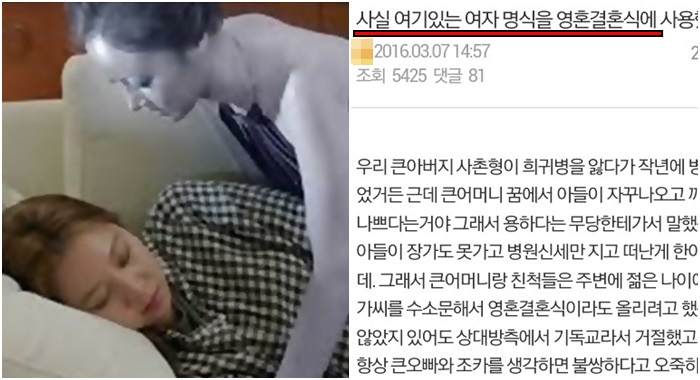 작성자 A씨는 희귀병을 앓다 작년에 세상을 떠난 사촌형의 영혼 결혼식 상대로, 인터넷에 떠도는 어느 여성 누리꾼의 ‘명식’으로 진행했다는 소름돋는 글을 전했다.