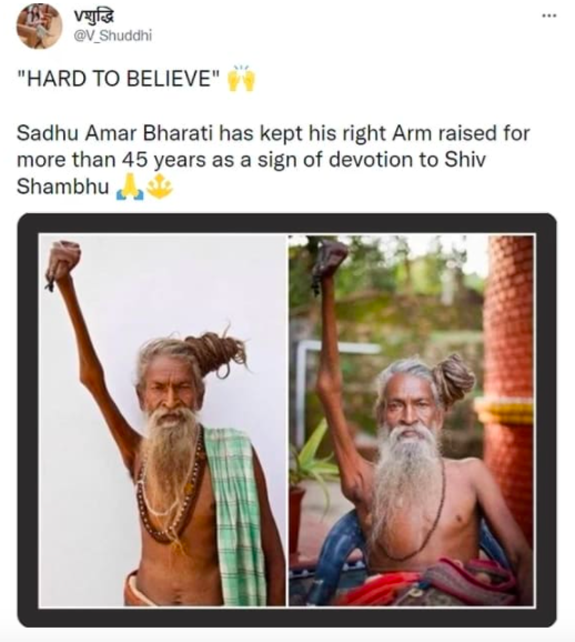 영국 일간 매체 ‘데일리스타’는 지난 5일(현지 시각) 힌두교의 시바 신께 자신을 바친다며 오른팔을 45년 이상 든 채 생활하고 있는 인도 승려 아마르 바라티의 상황을 공개했다.