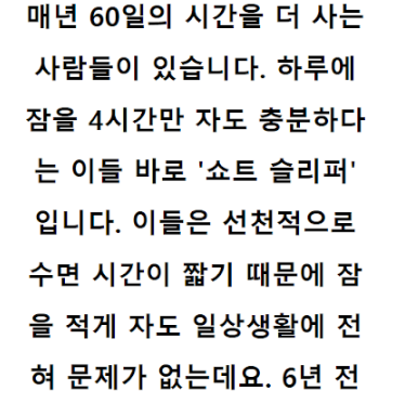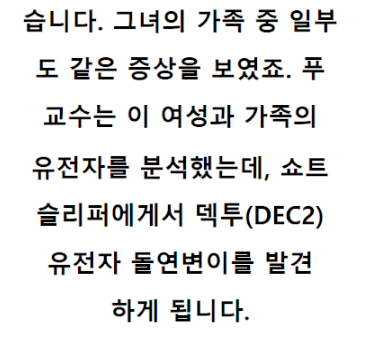 프타체크 교수는 “사람이 하루 8시간씩은 자야 한다는 믿음이 있는데 유전학적으로 보면 사람마다 필요한 수면의 양이 다르다는 게 확인됐다”며 “사람마다 키가 다르지만, 어느 정도의 신장이 완벽하다고 할 수 없는 것과 마찬가지”라고 밝혔다.