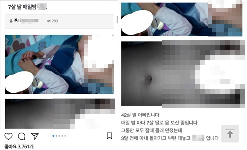 스스로를 7살 여자아이의 아빠라고 자칭한 작성자는 “아이의 엄마가 집을 비울 때마다 아이와 성관계를 가진다”며 본인의 성기를 아이의 얼굴과 하반신에 들이민 인증사진을 함께 올렸다.