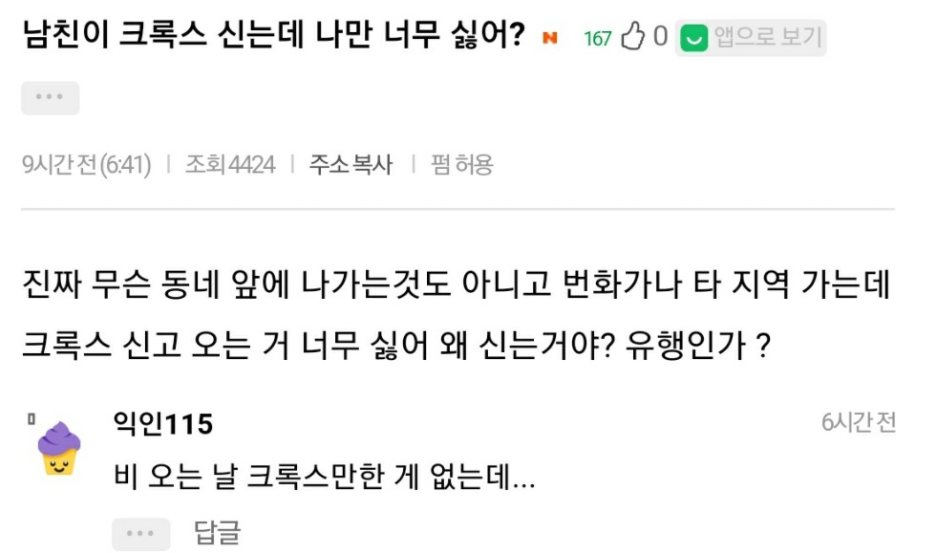 작성자 A씨는 “남친이 크록스 신는데 나만 너무 싫어?” 라는 제목의 글로 많은 이들의 궁금증을 증폭시켰다.
