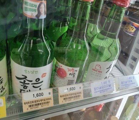 희석식 소주 – 참이슬, 처음처럼 등 편의점이나 식당에서 일반적으로 접하는 초록색 병 소주.