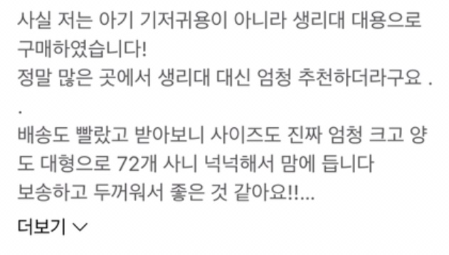 꼭 월경이 아니더라도 냉대하증의 분비물 처리, 치질, 요실금 관련 수술 후의 출혈 및 분비물 처리 등에 사용하기도 하고, 군대에서 공군 헌병들이 하이바 속에 몰래 붙이거나 혹한기·유격 지옥행군 등에 사용되기도 한다.