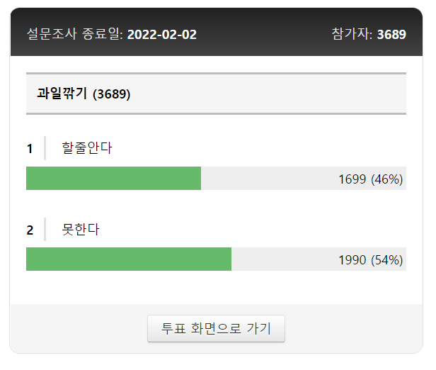 실제 커뮤니티에서 시행된 과일을 깎을 수 있는지에 관한 설문조사에서 참가자 3200명, 과일을 깎을 수 있다 1480명, 과일을 깎을 수 없다 1740명을 기록했다.